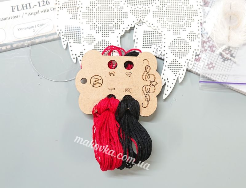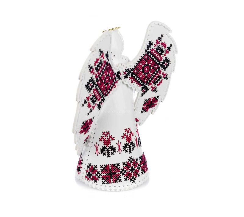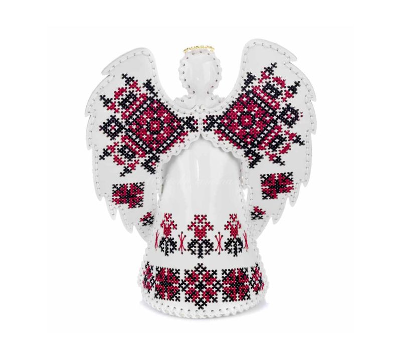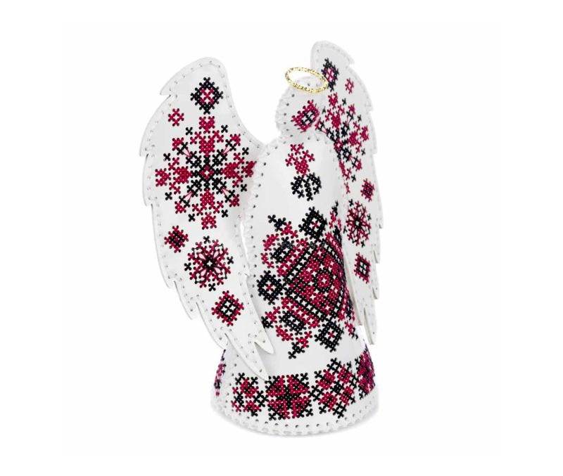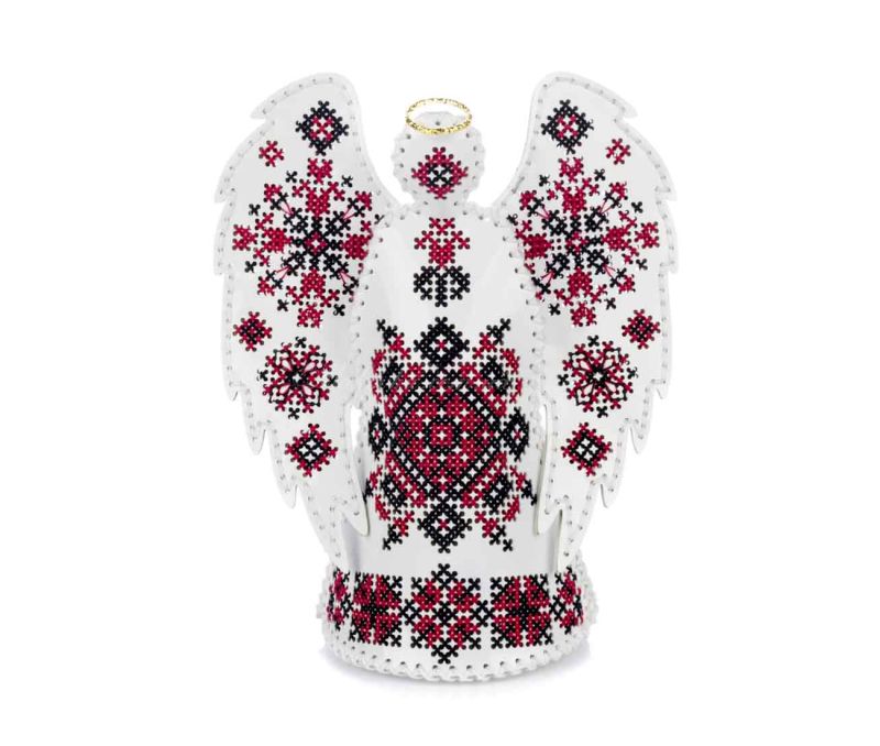 Центральним елементом дизайну є традиційні візерунки, що вишиваються на крилах та вбранні янгола. Червоні та чорні нитки на чистому білому тлі створюють класичний контраст. Завдяки високоякісному  муліне та об’ємній конструкції, готовий виріб виглядає як справжній витвір мистецтва.