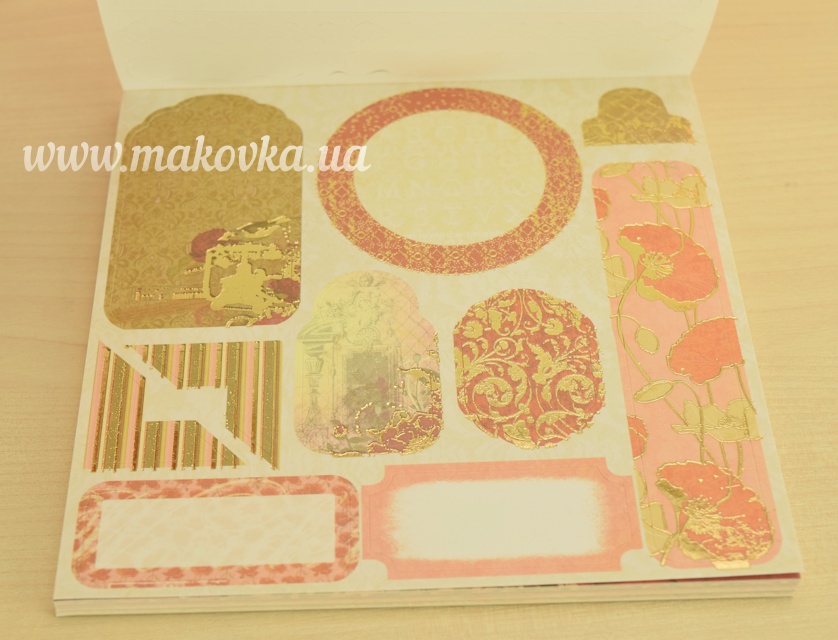 В альбоме 24 странички с разным дизайном. Всего 12 дизайнов по 2 страницы. И 2 страницы с тегами. Теги местами с золотым тиснением.