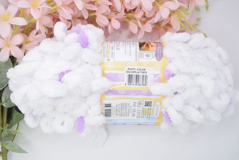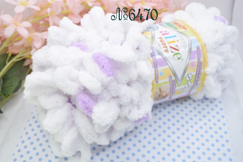 PUFFY color Alize - пухнаста пряжа з різнобарвним меланжевим фарбуванням для в'язання без спиць . Це дуже м'які довгошерсті плюшеві нитки для в'язання руками (без спиць і гачка) пледів, подушок, килимків та інших простих виробів. Також можна в'язати шарфи, снуди, шапки і більш складні вироби. Нитка товста, дуже м'яка і ніжна. Складається з однакових великих петель (петлі зафіксовані). Виглядає як букле, але в виробі рівний плюш.