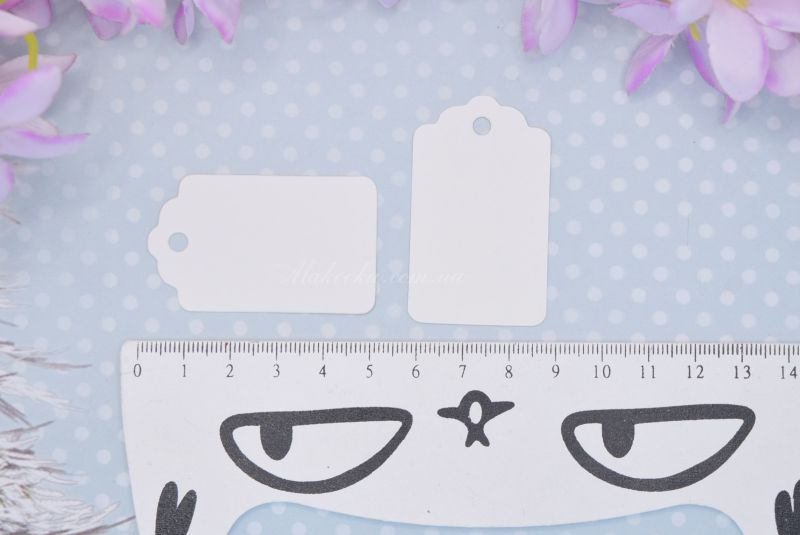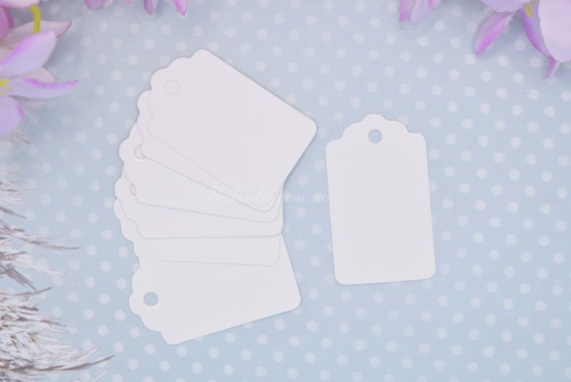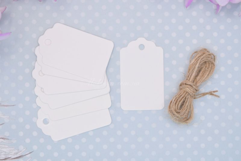 Прямокутні бирки з білого картону. З верхнього боку отвір і фігурний край. Для написів. Розмір: 3*5 см Ціна за 10 штук Вироблено: Китай