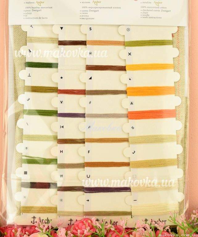 Набір входить канва Zweigart Perlleinen темно-бежевого кольору, схема чорно-біла символьна з великими значками, голка, інструкція, бавовняне муліне.