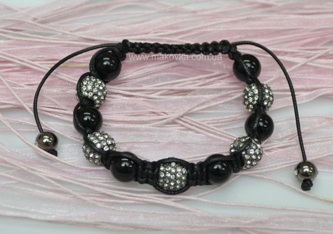 Браслет Шамбала 06 черно-белыйМодный браслет-шамбала. Пять металлических бусин инкрустированных белыми стразами и пять гематитовых бусинок. Материалы: черный вощенный шнур, металические бусины со стразами, гематитовые бусины. Не содержит никель, свинец и кадмий. Размер бусин: 10 мм Минимальная длина браслета 17 см |