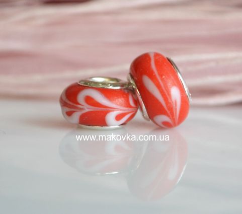 Стеклянная непрозрачная бусина красного цвета с белым орнаментом.