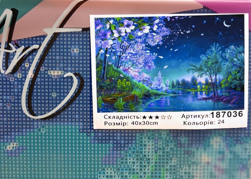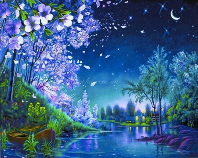 Пориньте в атмосферу магічної ночі з цією мальовничою мозаїкою. Сяйво місяця над тихою затокою, квітучі дерева в бузкових тонах та самотній човен біля берега створюють відчуття спокою та казковості.