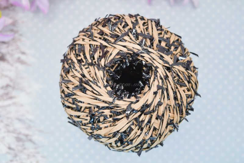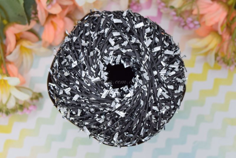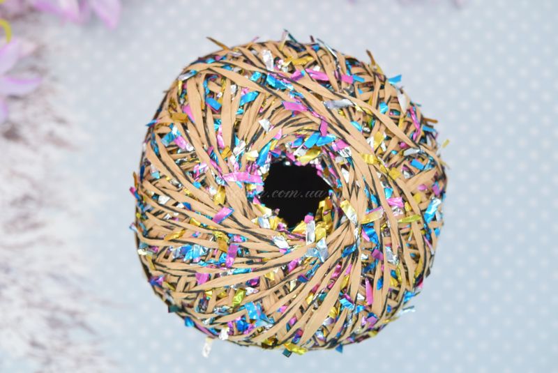 Confetti Milda - це неординарна цікава нитка для втілення ваших фантазій. Confetti Milda поєднує в собі тонку кручену рафію та декоративну дуже тонку нитку зі шматочками металізованої стрічки Metallic raffia. Додаткова нитка настільки тонка, що складається враження, що шматочки металізованої стрічки зав'язані прямо на рафії.