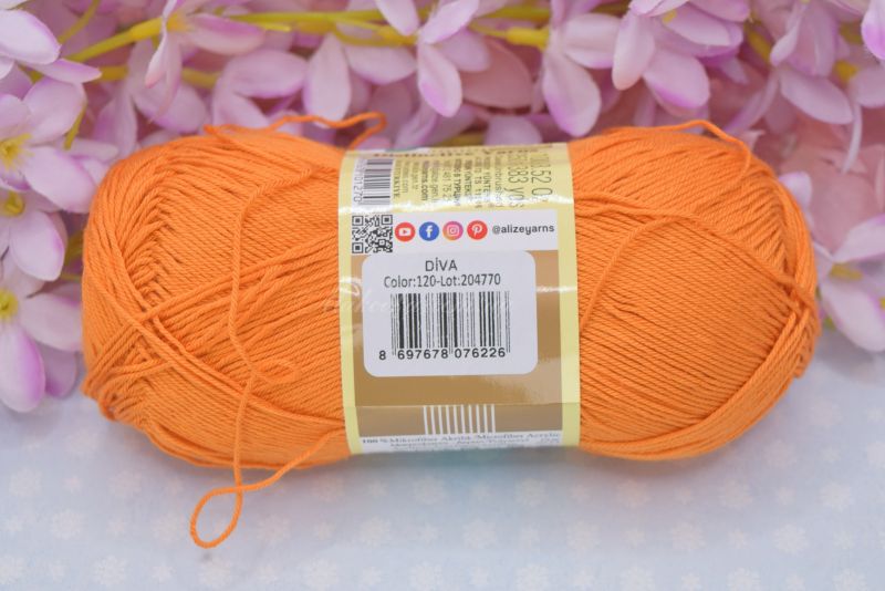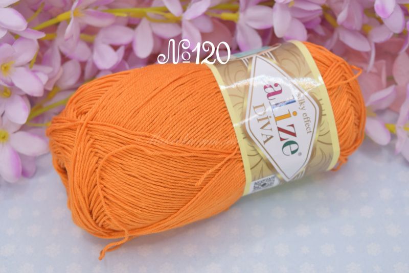 DIVA Alize - приємні на дотик, досить щільні нитки з приємним шовковистим блиском. Зовні трохи нагадують мерсеризовану бавовну, але виготовлені з мікрофібри (мікроакрил). Пряжею DIVA легко та комфортно в'язати, особливо гачком. Вона не "скрипить" як дешевий акрил і не розшаровується. Товщина приблизно 1 мм. Підійдуть для в'язання одягу, іграшок та аксесуарів.