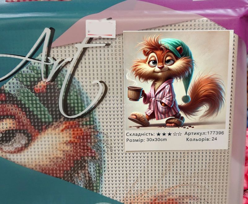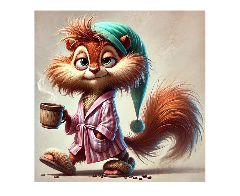 Кумедний та неймовірно милий сюжет із пухнастою білочкою в халаті та з горнятком кави, що втілює настрій неспішного ранку.
