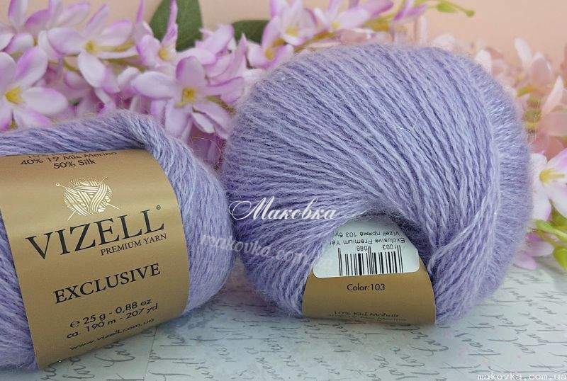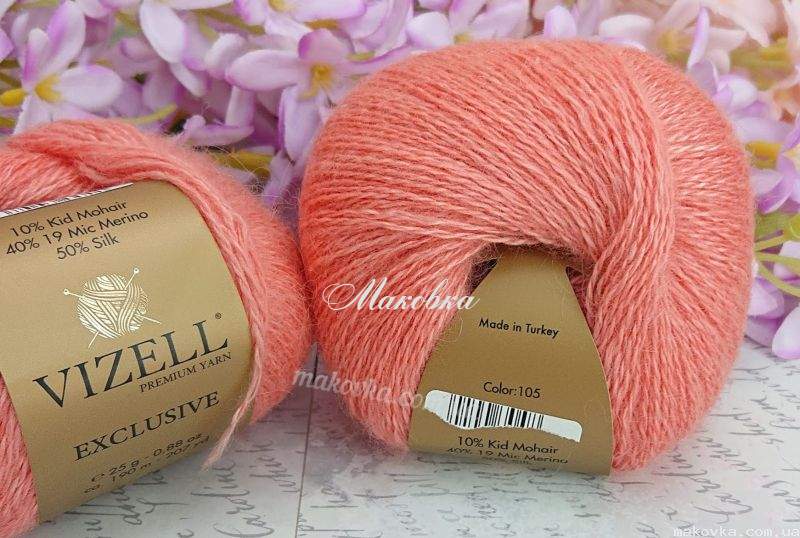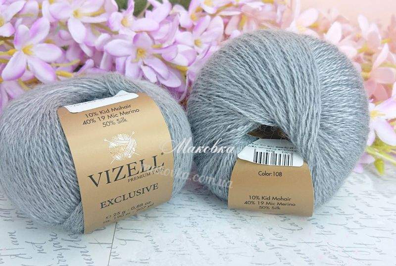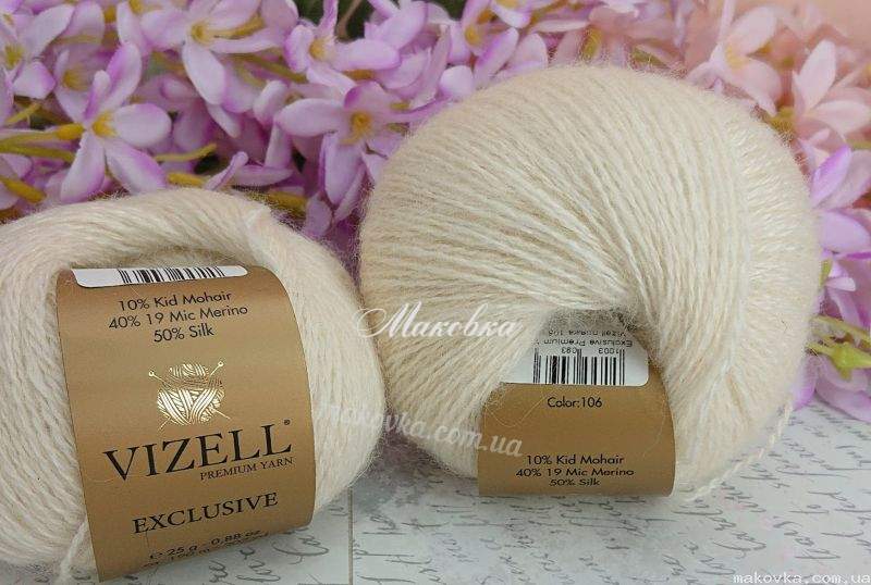 Пряжа VIZELL Exclusive - тонка пряжа преміум класу. У складі шовк, кід-мохер та ніжна мериносова вовна. Нитка м'яка, злегка ворсиста, з приглушеним блиском і трохи біляста.