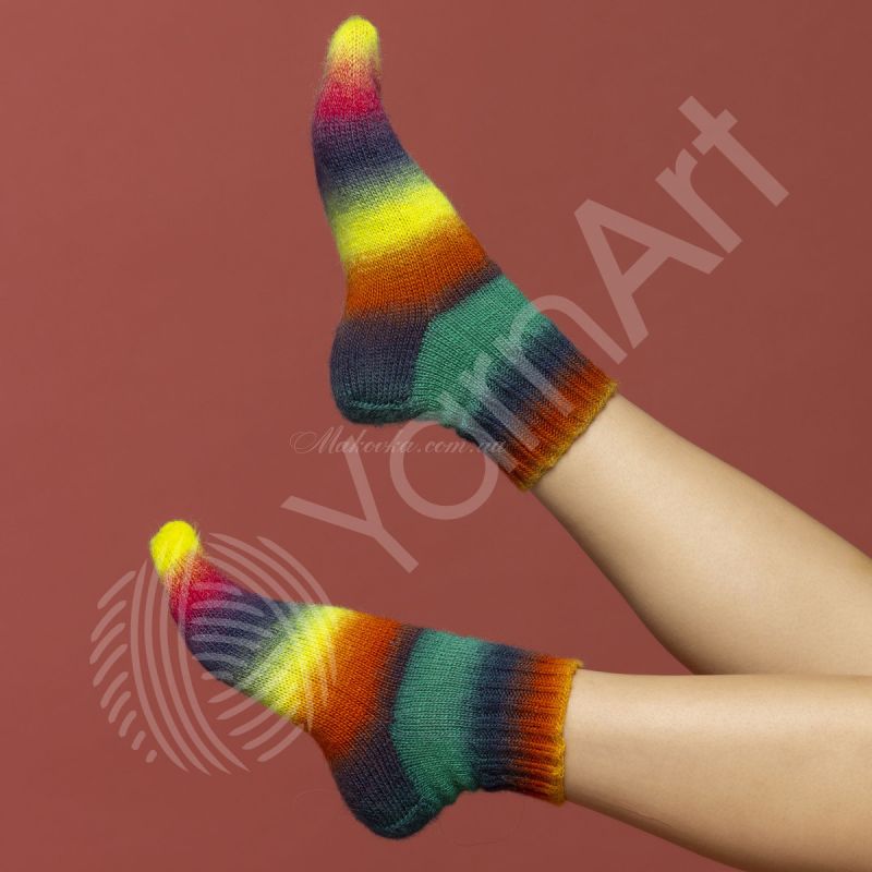 Коли ви в'яжете, смужки утворюються самі по собі, і не потрібно міняти на нитку іншого кольору. Це не лише зручно, але й вигідно, так як ви купуєте всього 1 моток ниток, а не кілька мотків різного кольору :) Мотка вистачає на пару шкарпеток стандартної висоти.