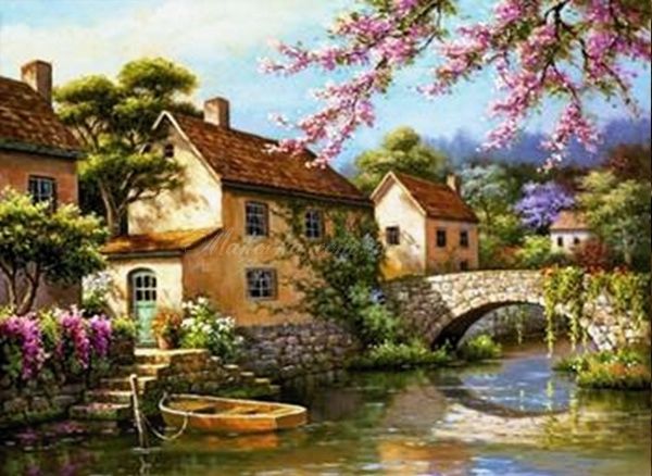 Мальовничий європейський пейзаж із затишними будиночками біля річки та квітучими деревами, виконаний у стилі реалізму.