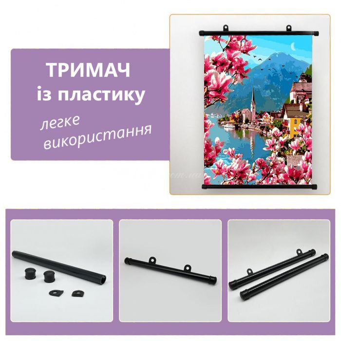 Тримач із трубчастою конструкцією забезпечує надійну фіксацію полотна. У комплекті дві пластикові трубки, бічні заглушки та кріплення для підвішування. Готова картина виглядає стильно і доглянуто.