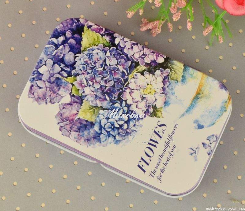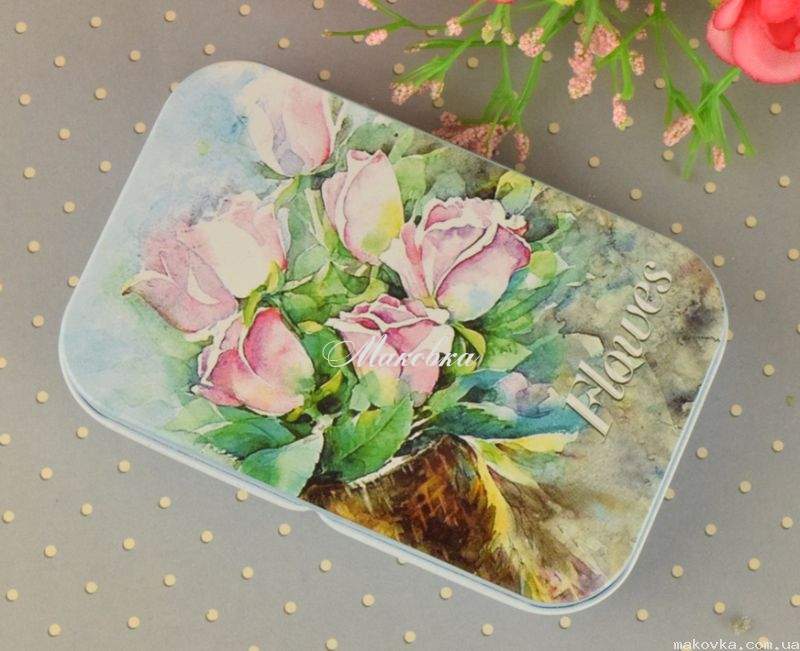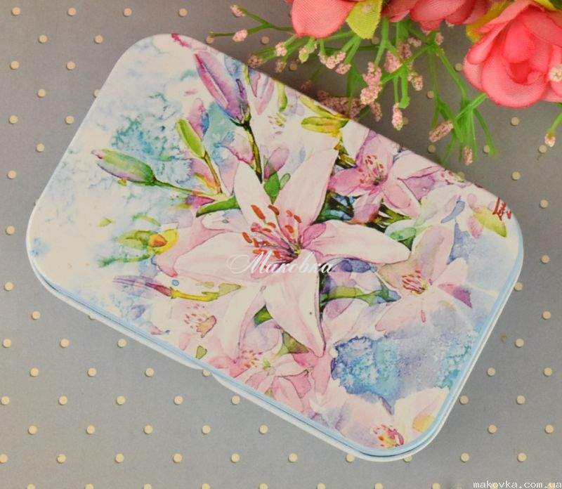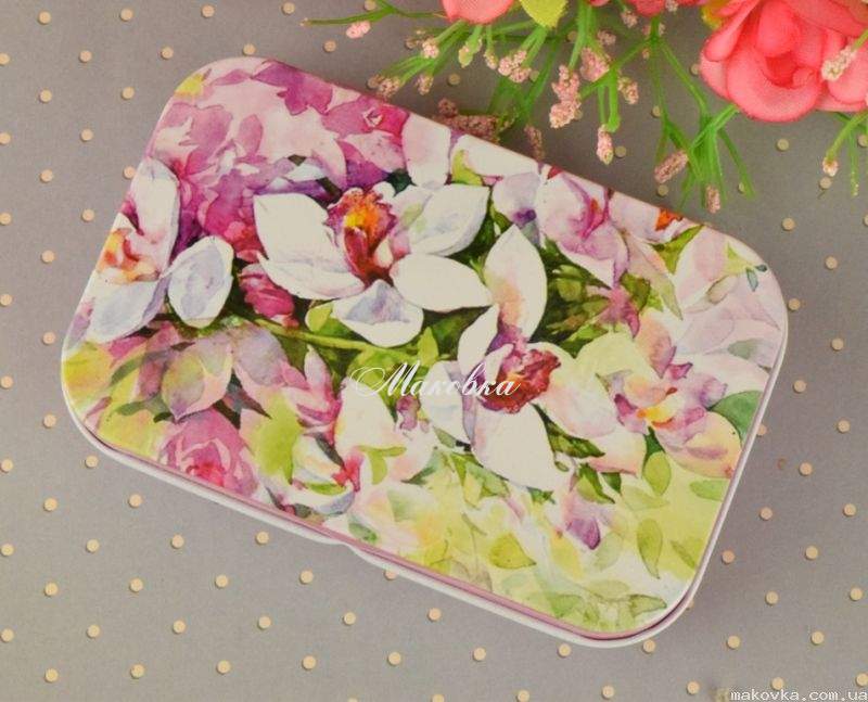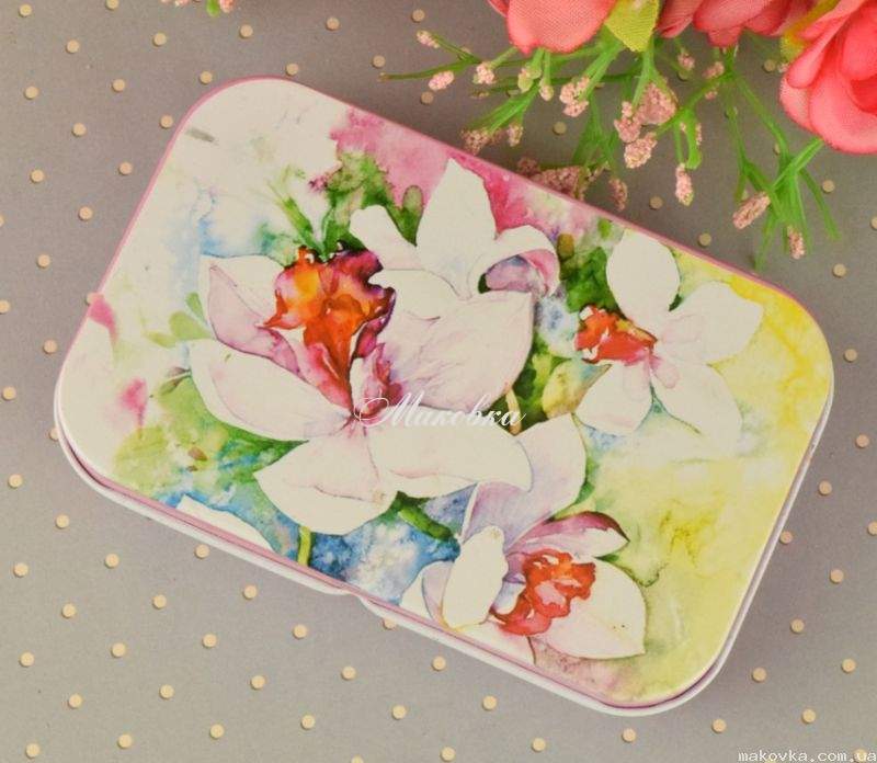 Коробочка жестяная с рисунком Цветы акварельные, прямоугольная, 9,5х6 см, 1 шт, рисунок на выбор