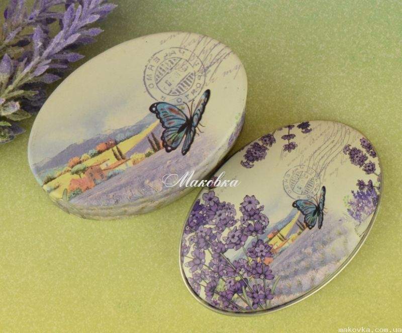 Коробочка жестяная с рисунком Лаванда, Овальная, 7х4,5 см, 1 шт, рисунок на выбор