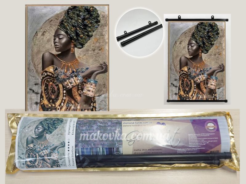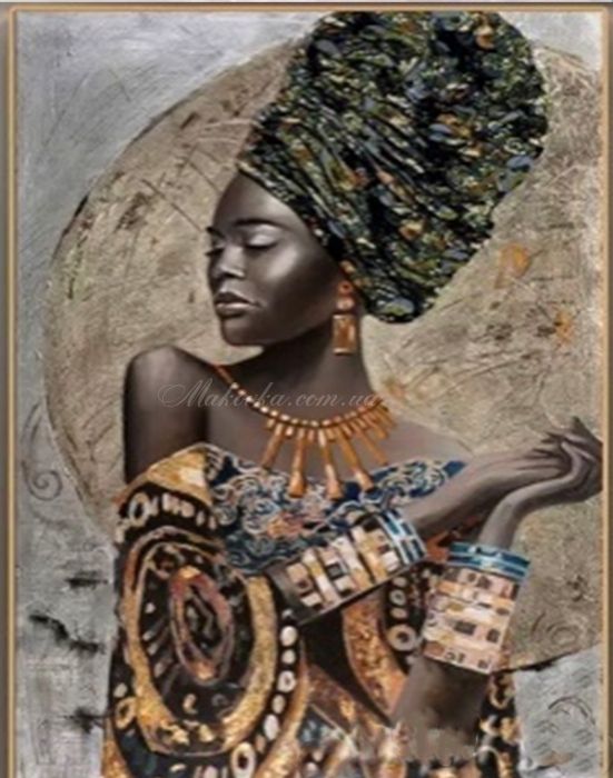 Витончений портрет африканської жінки у традиційному вбранні, виконаний в етнічному стилі. Завдяки стриманій палітрі та золотим акцентам, картина ідеально пасуватиме до інтер'єрів у стилі мінімалізм, лофт або екзотичне ар-деко.