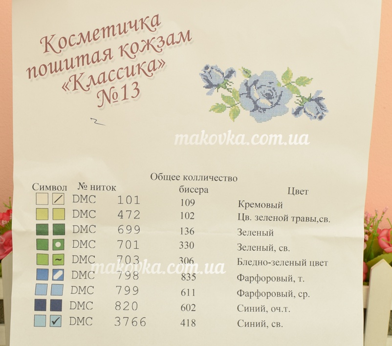 В комплекте есть ключ для пдбора ниток ДМС (казаны номера цвета) и бисера (указано количество бисеринок и описание цвета)