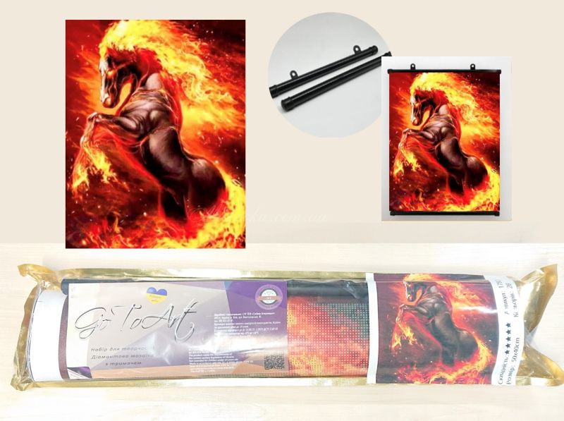 Тримач із трубчастою конструкцією забезпечує надійну фіксацію полотна. У комплекті дві пластикові трубки, бічні заглушки та кріплення для підвішування. Готова картина виглядає стильно і доглянуто.