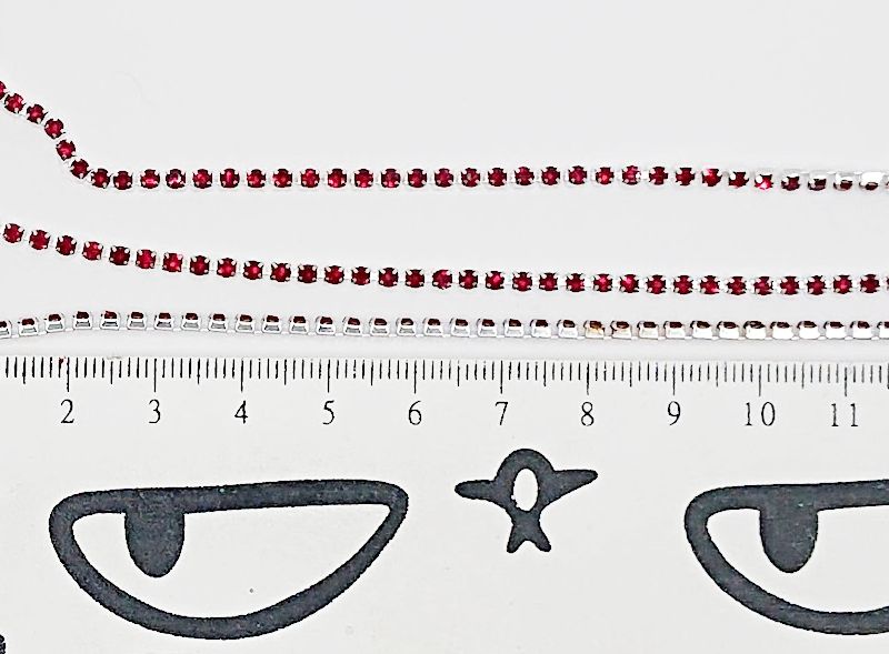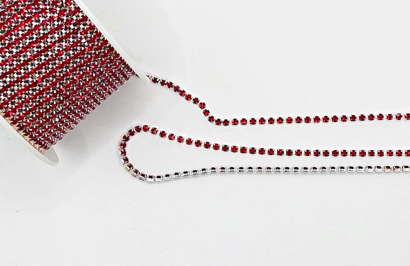 Стрази на металевому ланцюгу для виготовлення браслетів, прикрас для одягу, декору. Матеріал оправи: мідь. Колір оправи: під срібло 01-Silver Колір камінців: темний червоний C1126-Siam Страза ss-8 (2.3-2.4мм) Ціна за 10 см