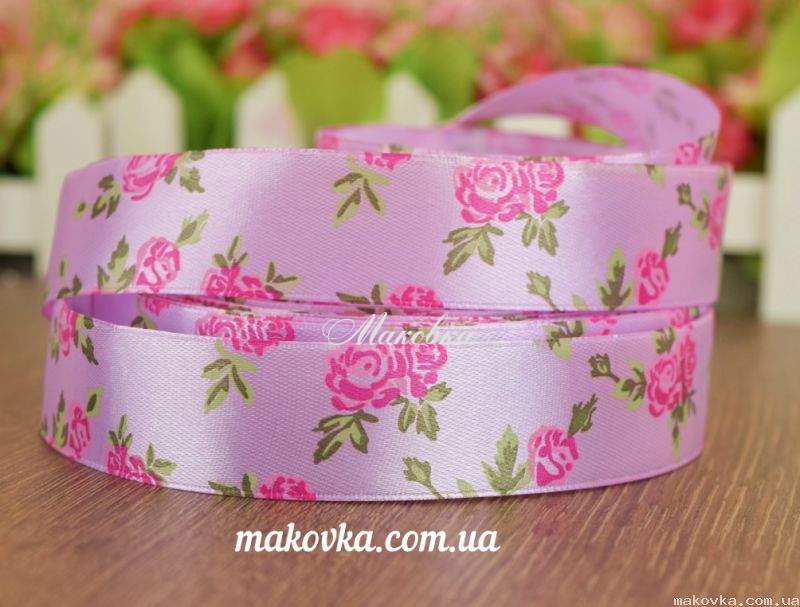 Широкая атласная лента с маленькими розочками. Тыльная сторона гладкая, без рисунка.