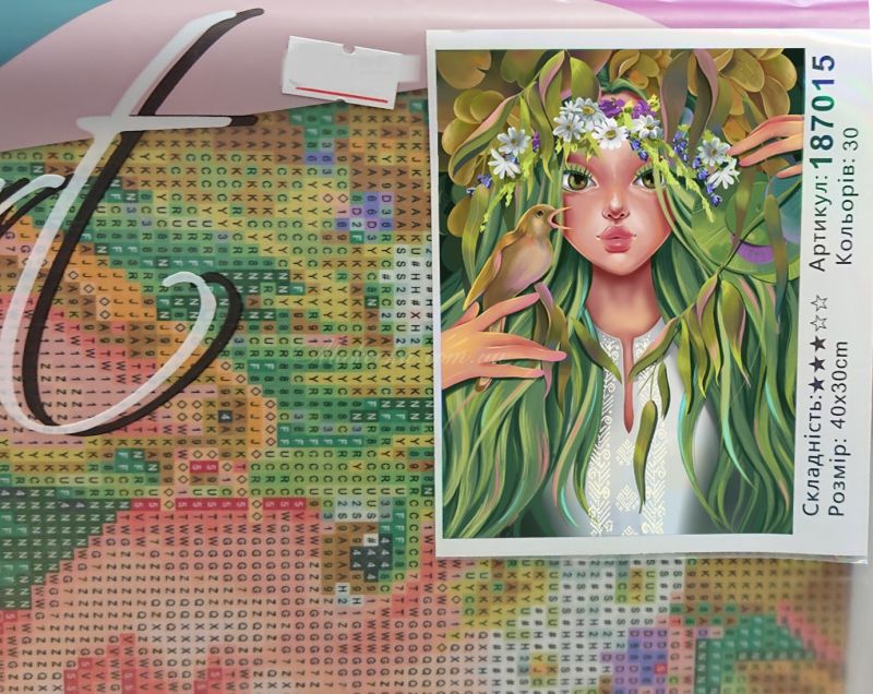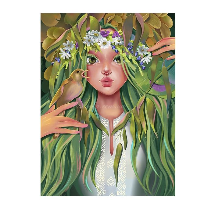 Чарівний образ «Лісової красуні», створений за мотивами художнього твору М. О. Ткаченка, оживає у форматі алмазної мозаїки. Казкова дівчина з волоссям кольору весняного листя та співочою пташкою на руці символізує єдність людини з природою та магію лісу. Завдяки палітрі з 30 насичених кольорів, картина має неймовірну глибину та деталізацію.
