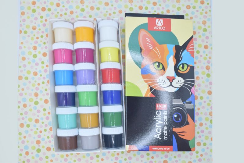 Набір акрилових фарб Arteo , які чудово підійдуть для малювання та розмальовування, для декорування поверхонь при декупажі, скрапбукінгу тощо. Фарба у невеликій баночці з пластиковою кришкою. Можна фарбувати картон, папір, дерево, фанеру, МДФ тощо
