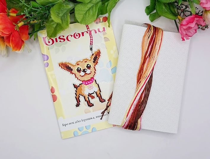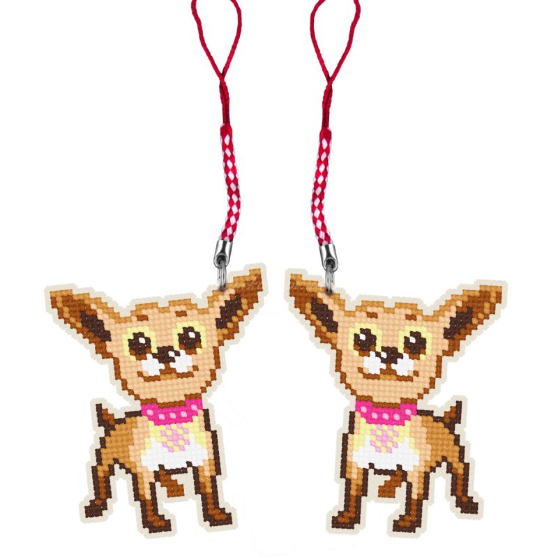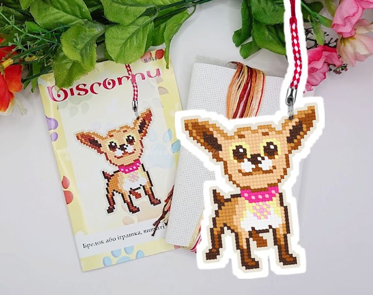 Милий та енергійний чихуахуа тепер може завжди бути поруч із вами! Цей набір дозволяє власноруч вишити мініатюрну фігурку собаки на пластиковій основі. Завдяки жорсткості канви брелок чудово тримає форму, а вишивка з обох боків робить його об'ємним та акуратним.
