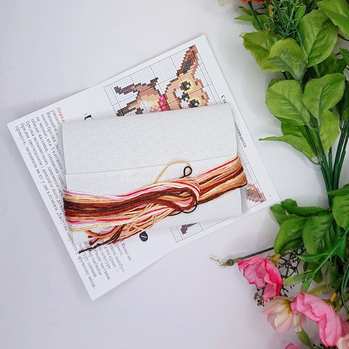 Усередині набору — велика кольорова схема всіх елементів для вишивання та докладна інструкція зі збирання.