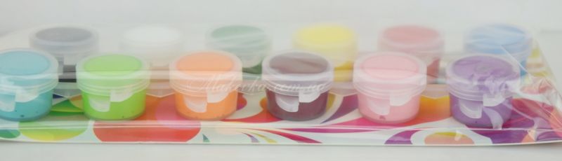 Набір яскравих акрилових фарб у маленьких баночках. Акрилові фарби універсальні, підходять для розпису паперових, картонних, дерев'яних поверхонь, а також заготовок з фанери, МДФ, пінопласту тощо.