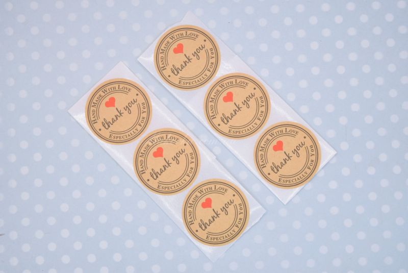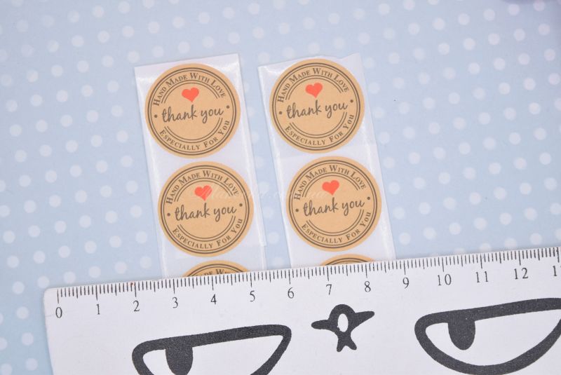 Круглі маленькі паперові наліпки - бірки, з написом HAND MADE...Thank you Розмір наліпки приблизно: 25 мм