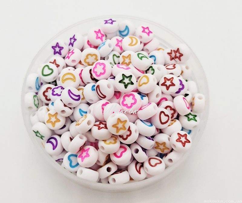 Намистини акрилові Круглі ,7 мм, білий мікс з кольоровим малюнком сердечко, зірка, місяць 10г