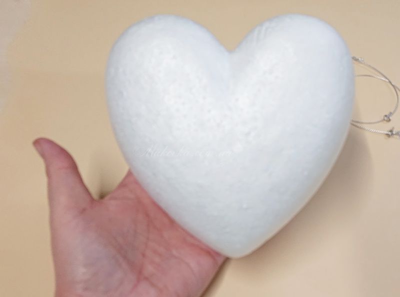 Об'ємне сердечко з пінопласту. Має гладку рівномірну поверхню. У комплекті є шнурок із штифтом для підвішування.