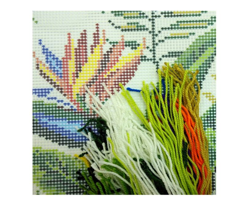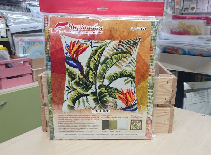 У Наборах для вшивання подушки ТМ Чарівниця використовуються товсті нитки і велика канва (страмін) з нанесеним малюнком