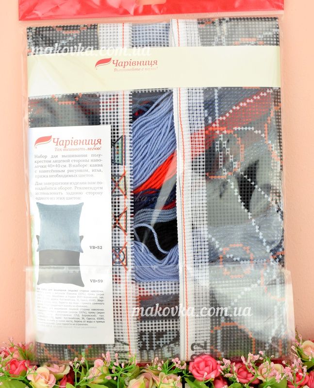 У наборах для вишивання подушки ТМ Чарівниця використовуються товсті нитки і велика канва (страмін) з нанесеним малюнком