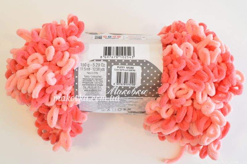 Розмір петлі у ниток PUFFY MORE Alize трохи менше, ніж у PUFFY Fine. Ворс велюровий - густий і коротко стріжен. Проте, завдяки двошаровому в'язанню, виріб виходить щільним, товстим і дуже теплим.