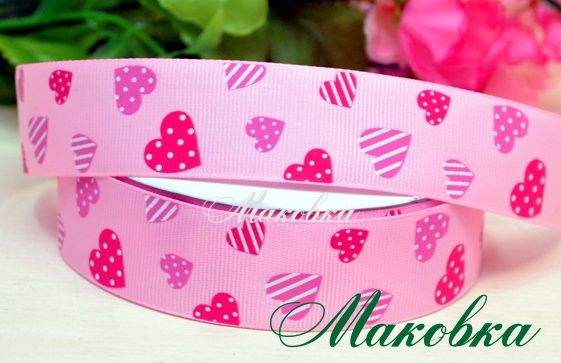 Репсовая лента 25 мм №05 Розовая с малиновыми сердечками, 1 м