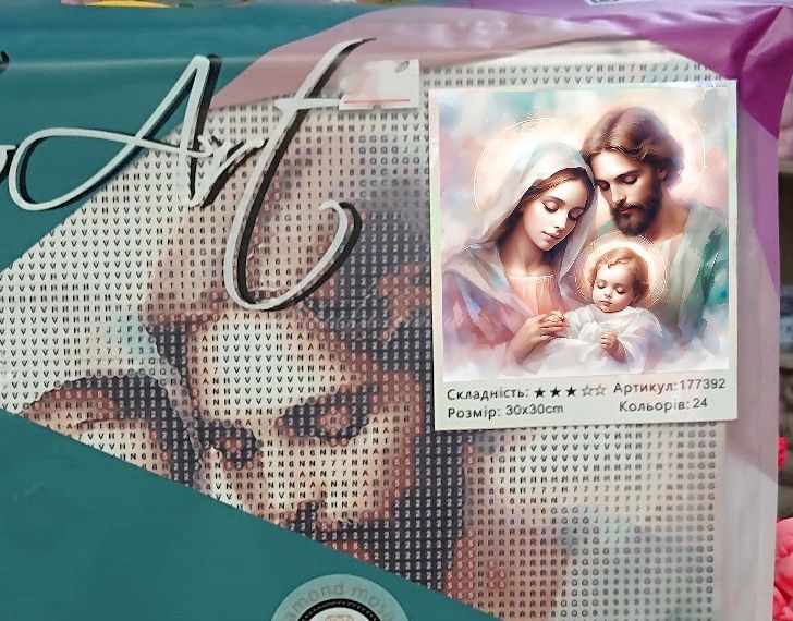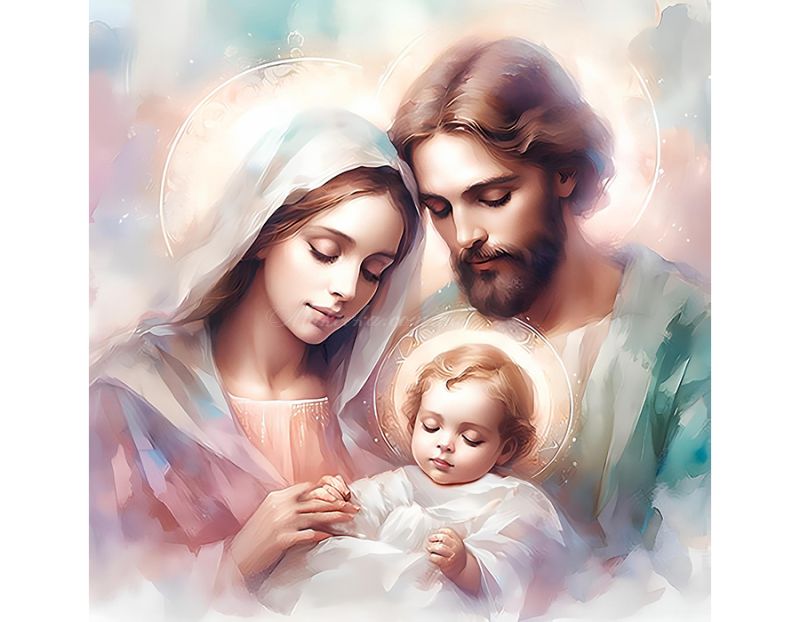На зображенні в ніжних пастельних тонах представлено Святе Сімейство - Діву Марію, Йосипа та немовля Ісуса, які схилилися один до одного в атмосфері любові та спокою.