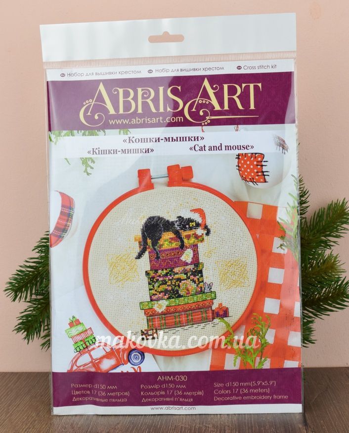 Милая схемка с котиком на новогодних подарках. Крест и декоративные стежки.