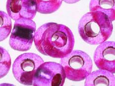 Crystal silver lined and dyed - прозрачный из бесцветного стекла с цветным отверстием и сверкающим «огоньковым» покрытием. У этого бисера может быть отверстие круглое (r.h.) и квадратное(sq.h). Бисер с серебряным прокрасом устойчив к истиранию и выцветанию, но он может изменить цвет при воздействии веществ, содержащих серу, кислоты или хлор.