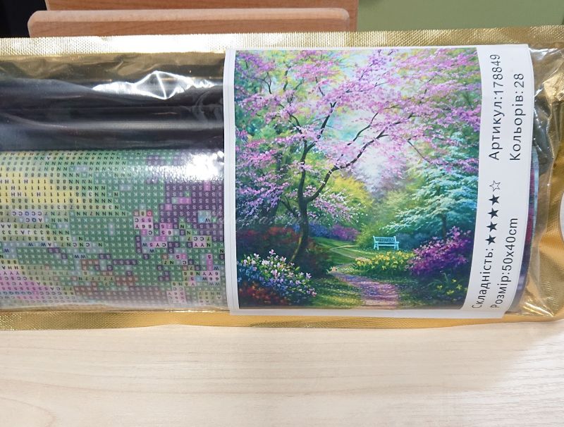 Поверхность покрыта липким слоем к которому приклееваются стразики. Рекомендуется не снимать защитную пленку со всей картины, а только с участка над которым вы работаете. Во избежание пересыхания не держать возле отопительных приборов и под лучами жаркого солнца.