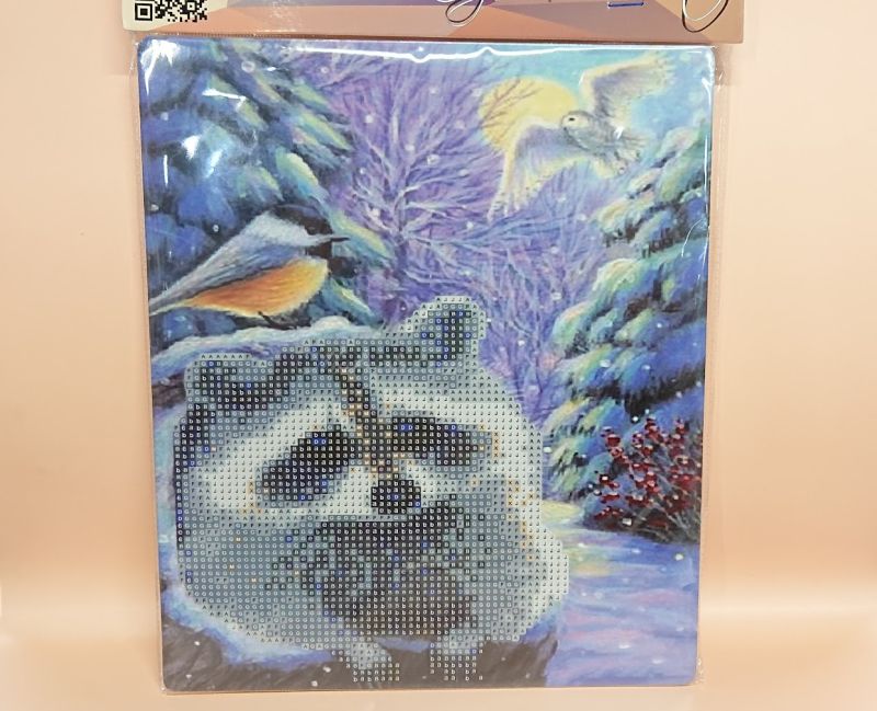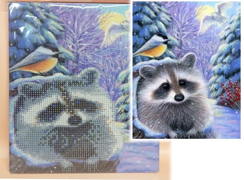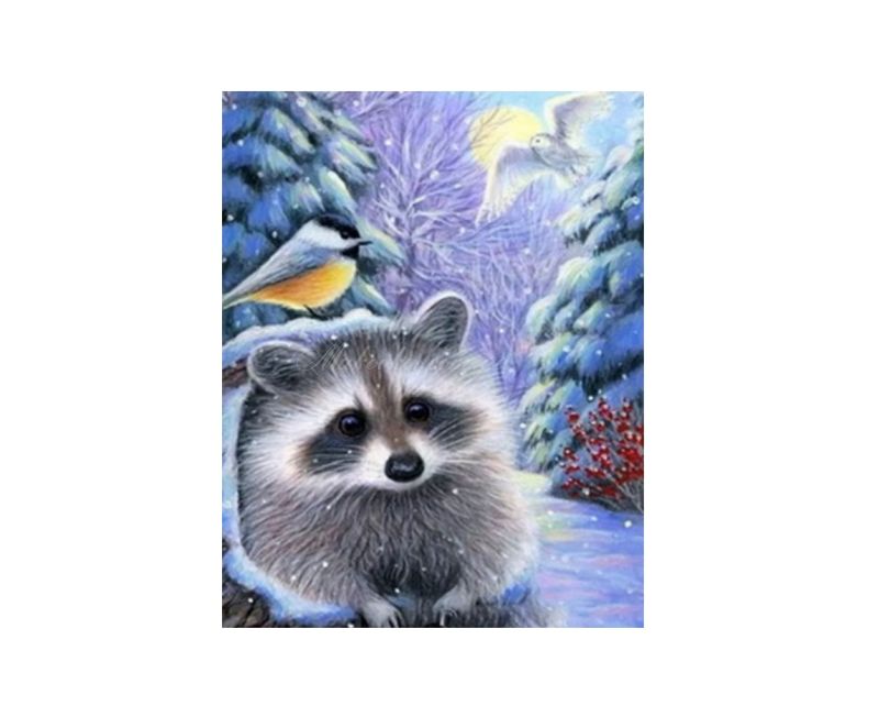 Енот и зимний пейзаж. Небольшая картина. Частичная заклейка