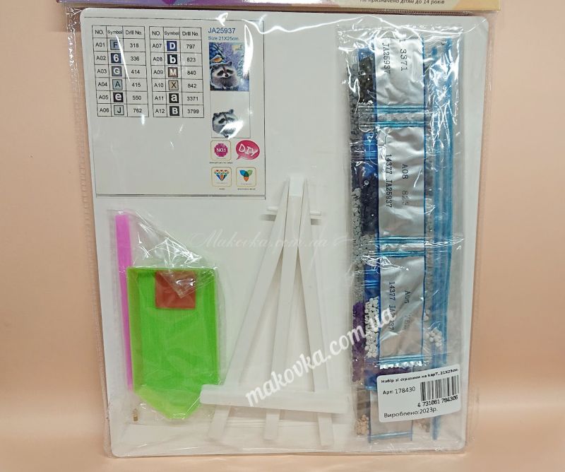 Состав: основа с клейкой поверхностью (частично или полностью), стразы, контейнер для страз, карандаш для переноса страз, сухой клей, подставка-мольберт.
