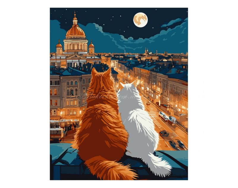 Рыжий и белый кот на крыше любуются ночным городом.