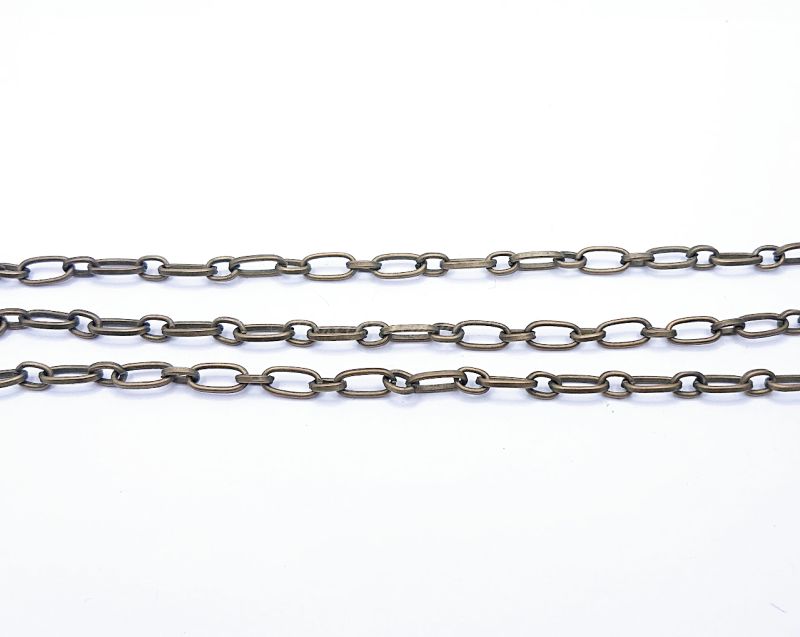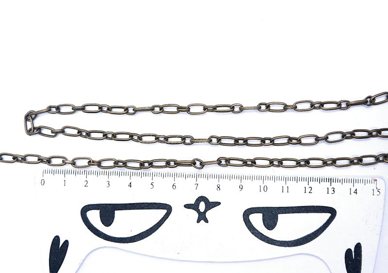 Декоративная цепь с поочередным плетением: удлиненное овальное звено соединяется с меньшим круглым или коротким овальным звеном. Это создает элегантный и необычный ритм, который идеально подходит для авторских изделий.