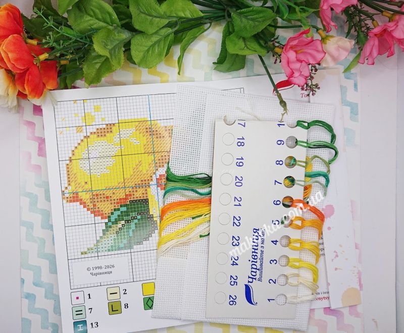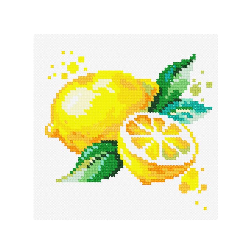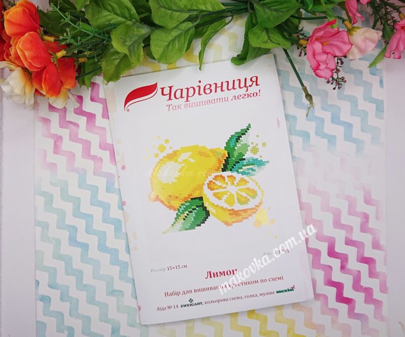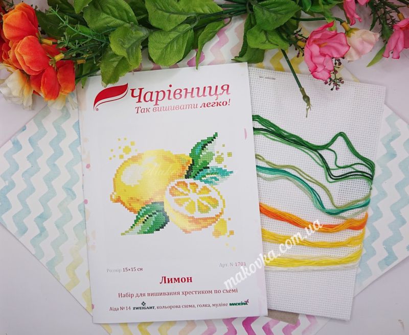 Набор для вышивания крестиком «Лимон» от бренда «Чарівниця» (N-1701). Это легкая и позитивная работа в стиле современного акварельного натюрморта с декоративными брызгами, которая идеально подходит для начинающих благодаря канве Аида №14 Zweigart и понятной цветовой схеме.