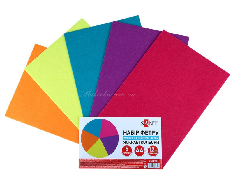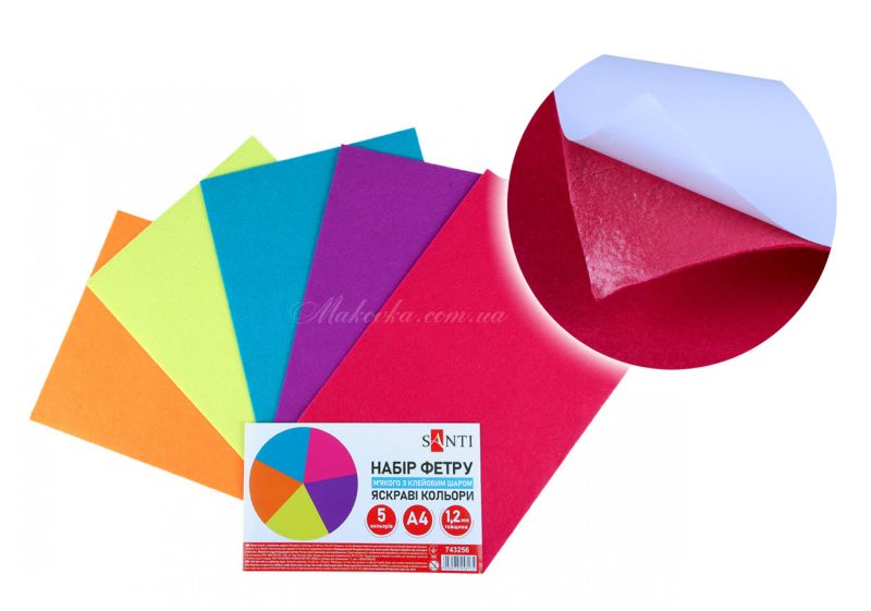 Набор из пяти различных цветов мягкого фетра с клейким слоем.