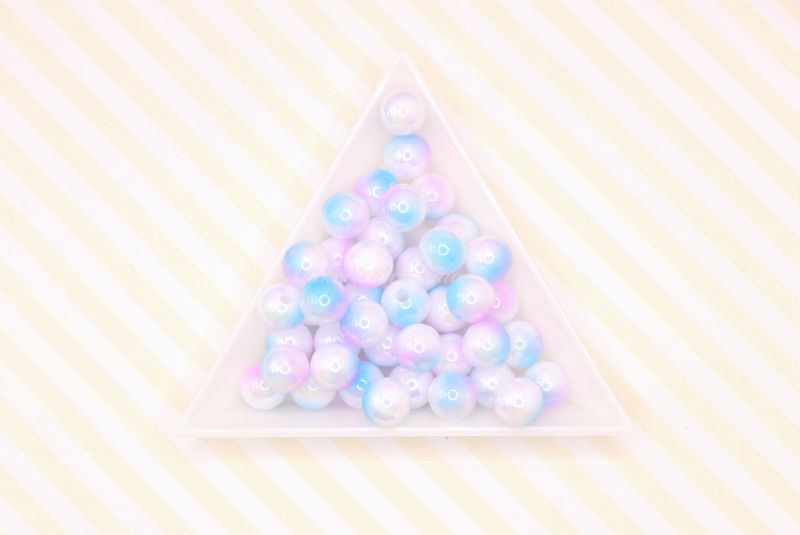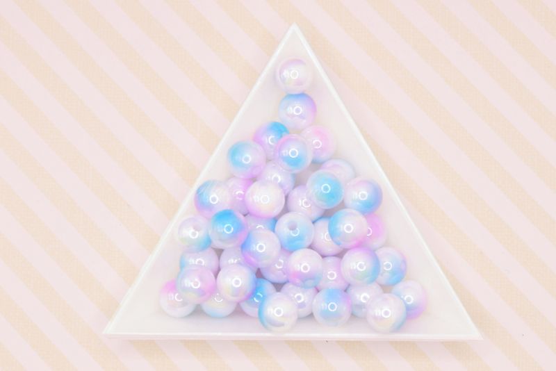 Непрозрачные шарообразные бусины с нежным градиентным переливом, сочетающим оттенки небесно-голубого, лавандового и пастельно-розового цветов на чистом молочном фоне. Сверху покрыты прозрачным лаком, который дает мягкие белые блики, создавая изысканный жемчужный блеск.