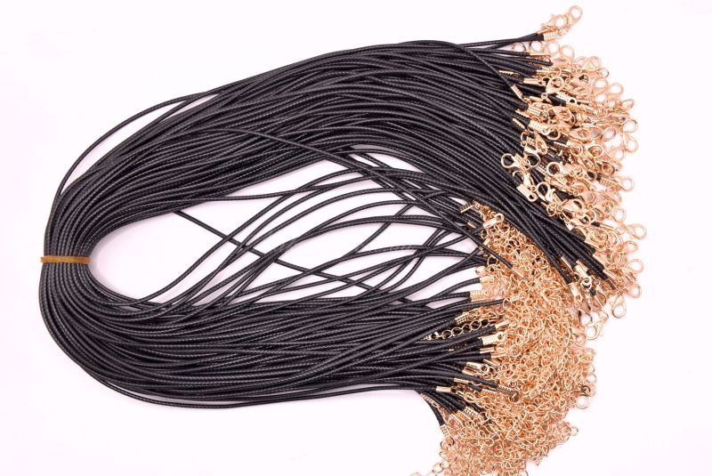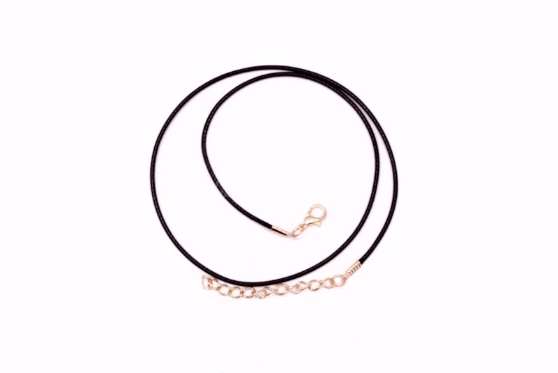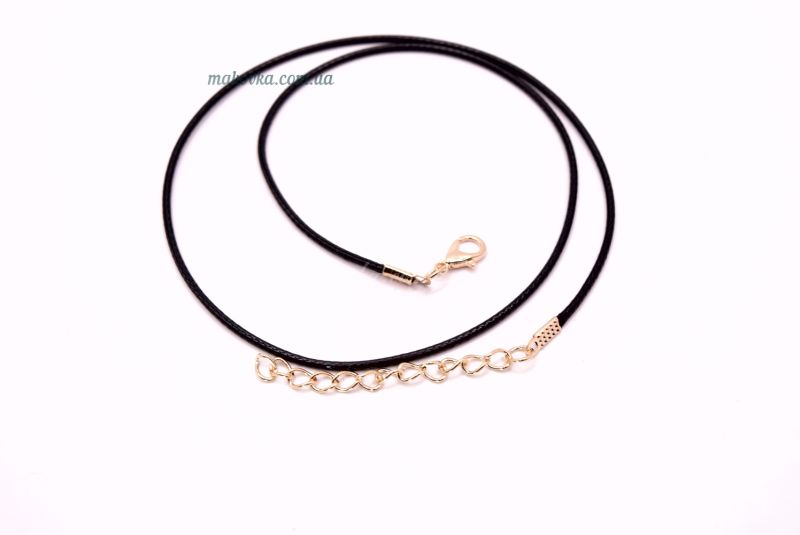 Гибкая основа для колье из вощенного шнура со специальным покрытием. Имеет замочек-карабин с одной стороны и удлиняющую цепочку длиной 4-5 см с другой стороны. Металлические компоненты золотого цвета.
