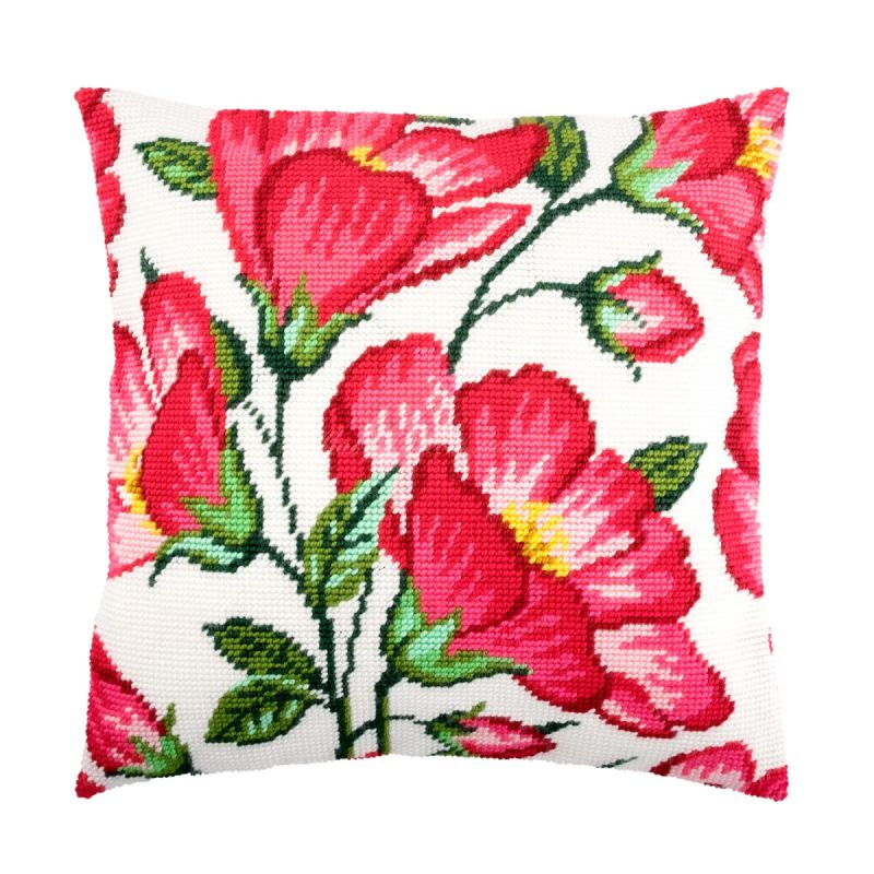 Этот живописный сюжет с крупными розово-красными цветами на чистой белой канве наполнит ваш дом теплом и уютом.