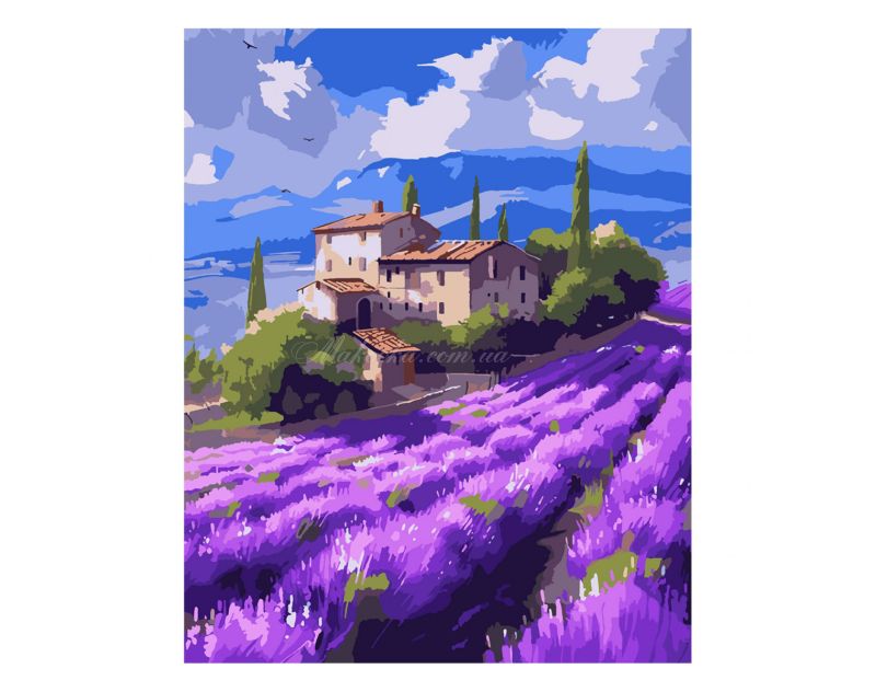 Прованский пейзаж с домиками и цветущей лавандой.