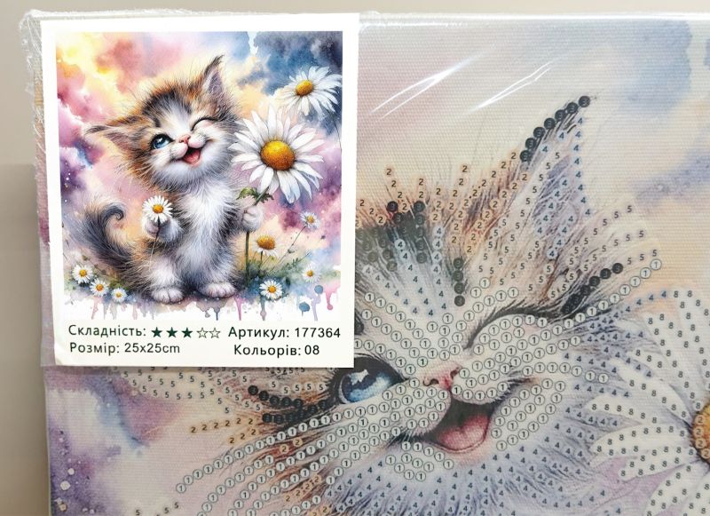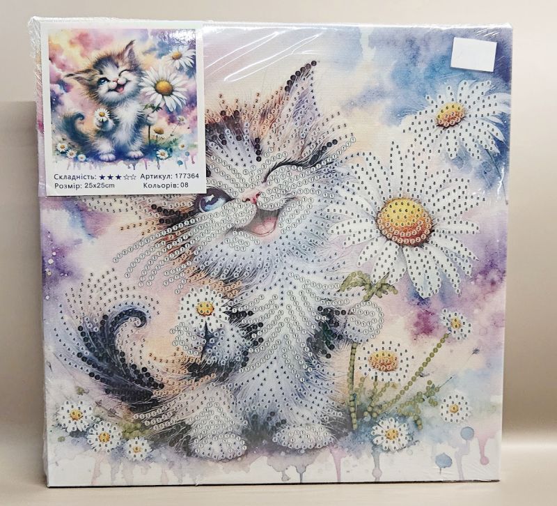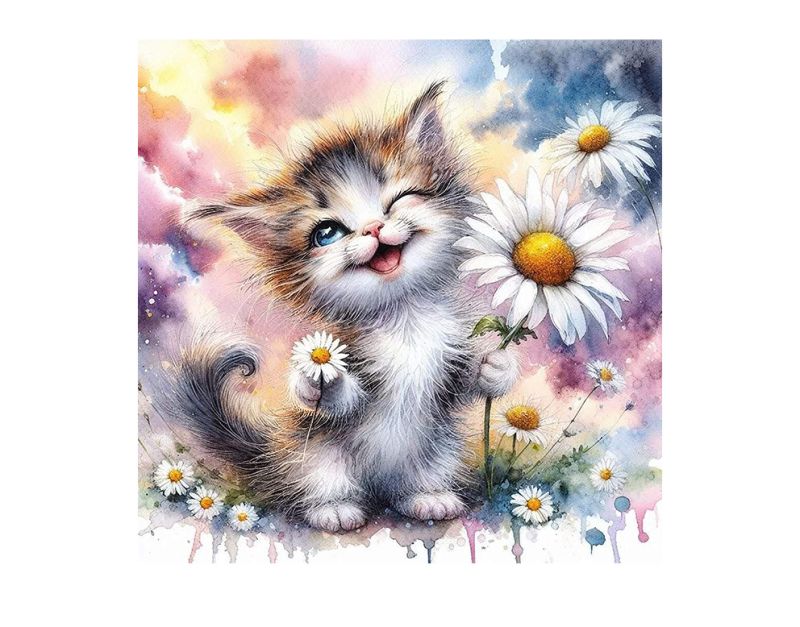 Счастливый котенок с ромашкой. Несложная картина с частичным заклеиванием рисунка стразами.