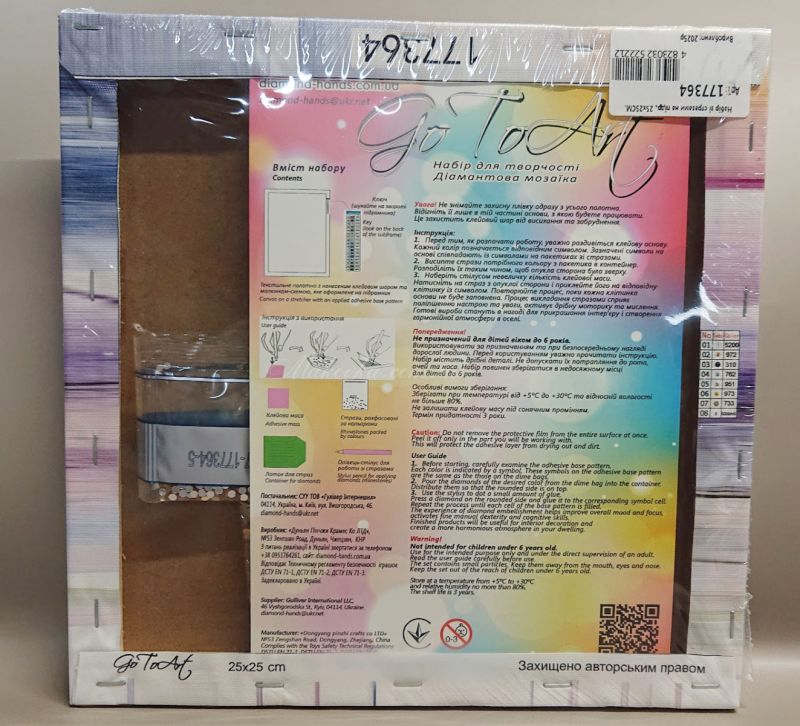Состав: полотно с клеющимся основанием (или частично с клеющимся), деревянный подрамник, стразы, контейнер для страз, карандаш для страз, сухой клей, инструкция по использованию.